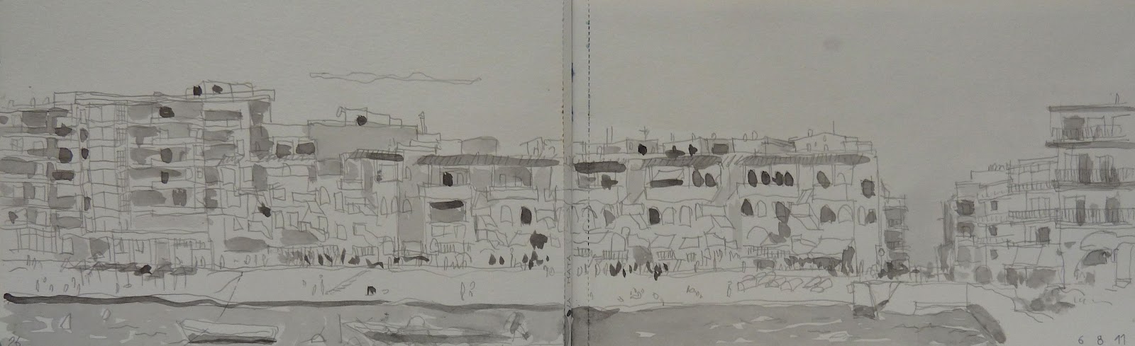 En verano dibujo el paisaje de la Mata, una pedania de Torrevieja. Una ciudad construida a lo largo de la costa, que va uniendo pueblos tras pueblo de una forma caótica. Con sus casa de vacaciones mal construidas. Edificios que se asoman al mar para ver el horizonte azul, peleando por la brisa del mar por la primera linea de playa.